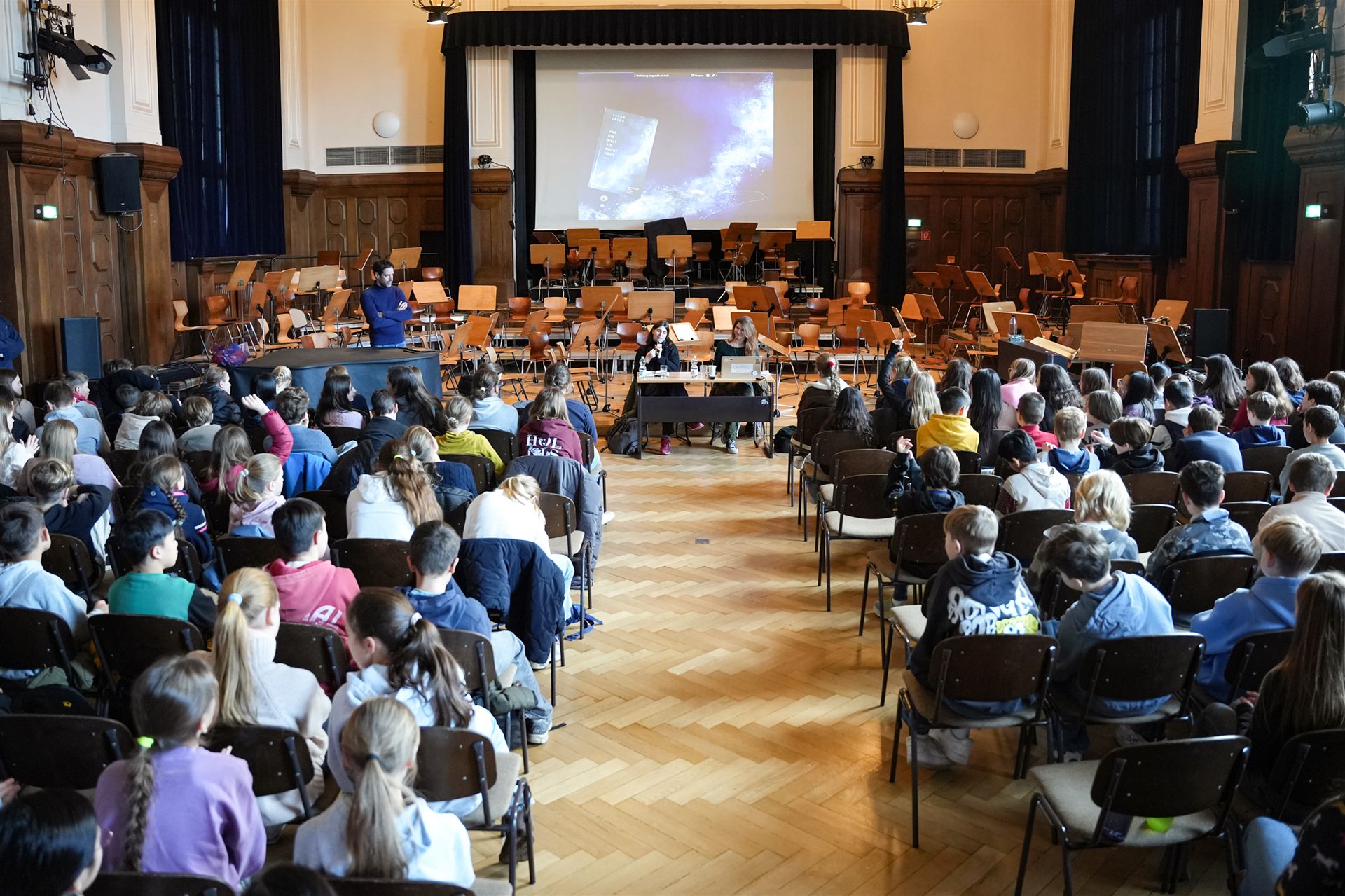 Zu Gast waren die Autorin Sarah Jäger sowie die Illustratorin Sarah Maus. Gemeinsam stellten sie ihr Buch „Und die Welt, sie fliegt hoch“ vor, für das die beiden 2025 den Jugendliteraturpreis erhalten hatten.